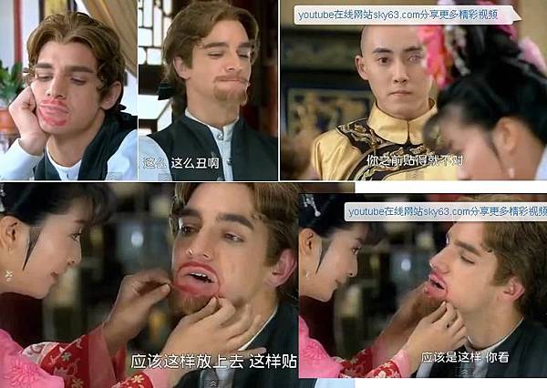 小燕子最後還是知道班杰明的紅嘴,還主動幫他貼鬍子,好溫柔的貼啊~班杰明好享受…五阿哥看了很吃醋...